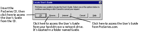 If you click Cancel, the Locate User’s Guide dialog box appears so you can direct the ProSeries program to a CD, your hard drive or network drive, or ProSeries.com.